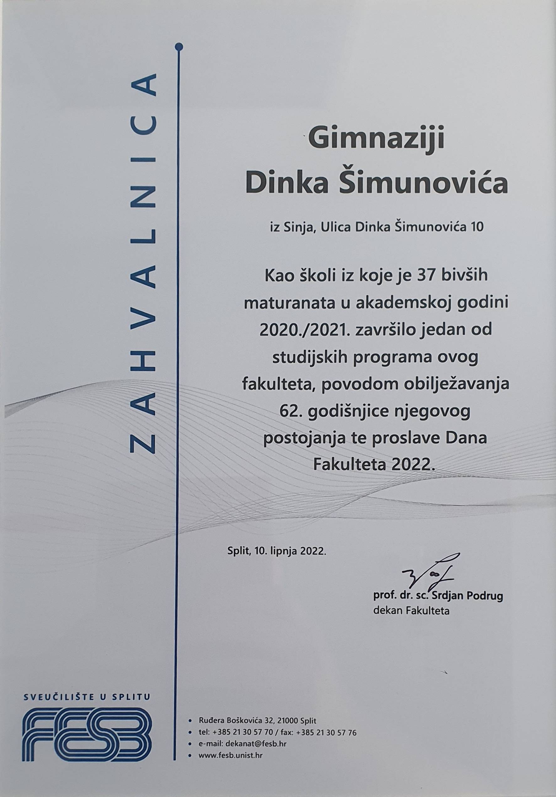 Gimnazija Dinka Šimunovića u Sinju dobitnica priznanja FESB-a
